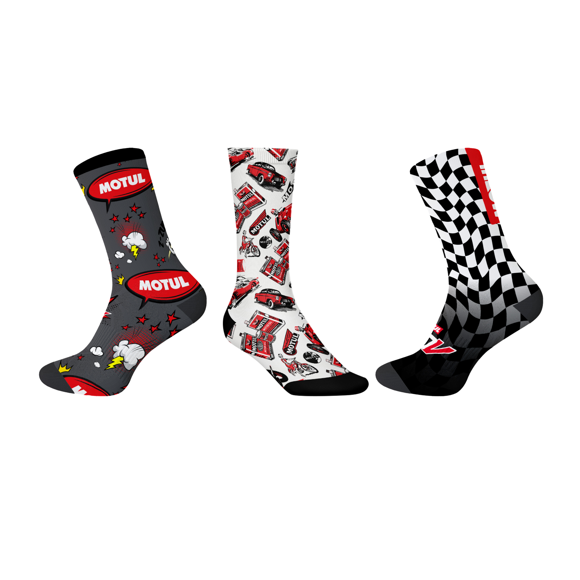 The Motul Sock Set – 3 Piece is a high-octane mix of comic flair, vintage icons, and motorsport cool. With three distinct designs in every set—Motul Comic Boom, Motul Classics Collage, and Chequered Flag Fade—this collection blends street style with racetrack roots.